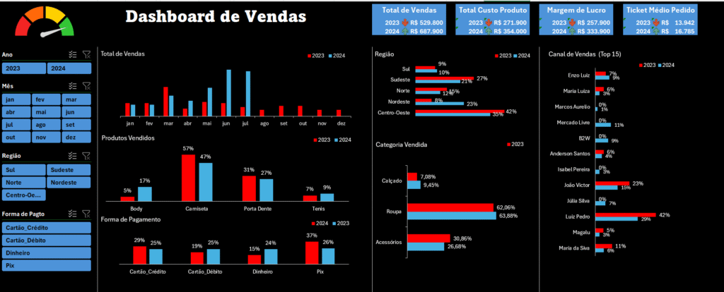 - Dashboard de Vendas: acompanhamento de metas, desempenho por região e análise de ticket médio.